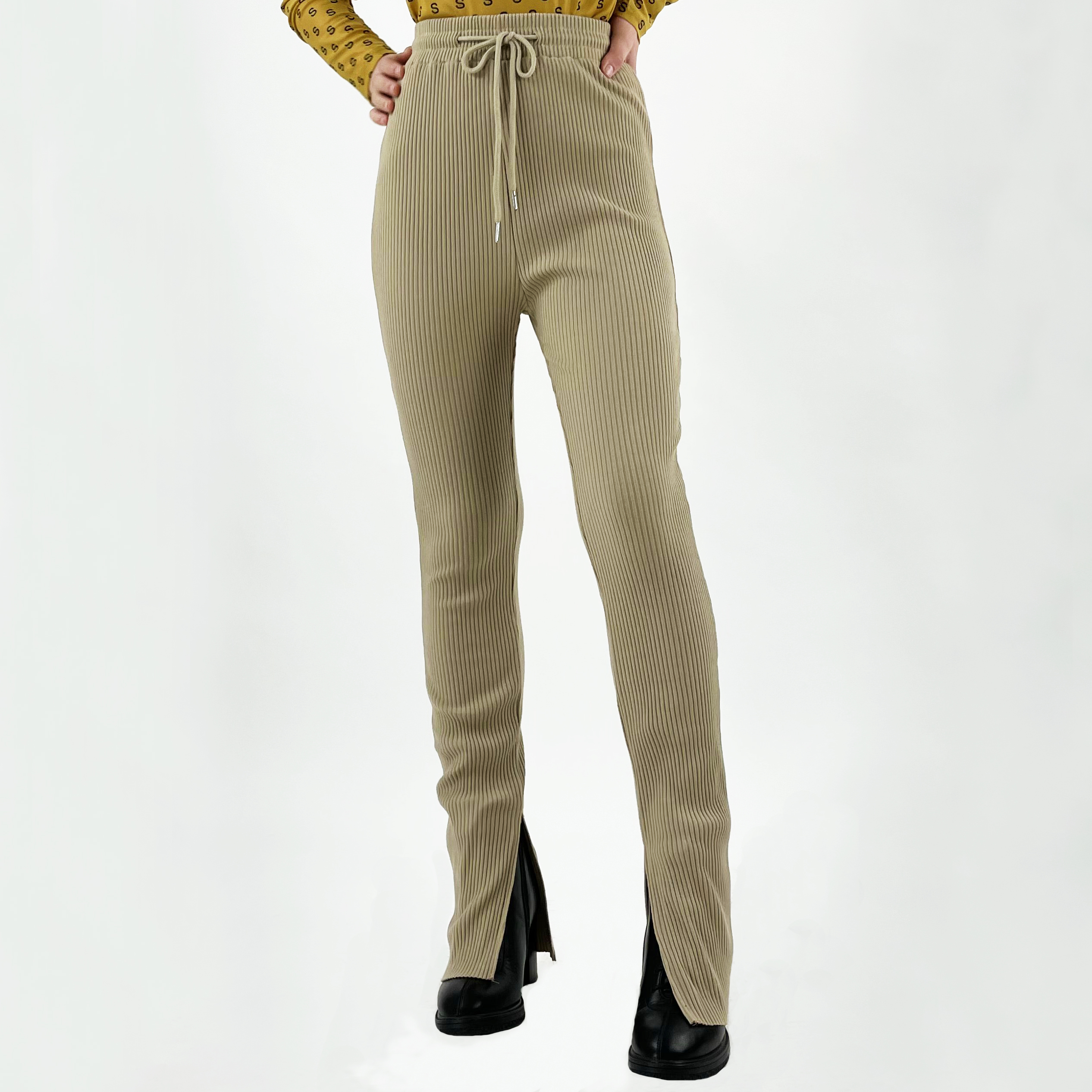 Штаны трикотаж рубчик разрезы по бокам на поясе шнурок в цвет