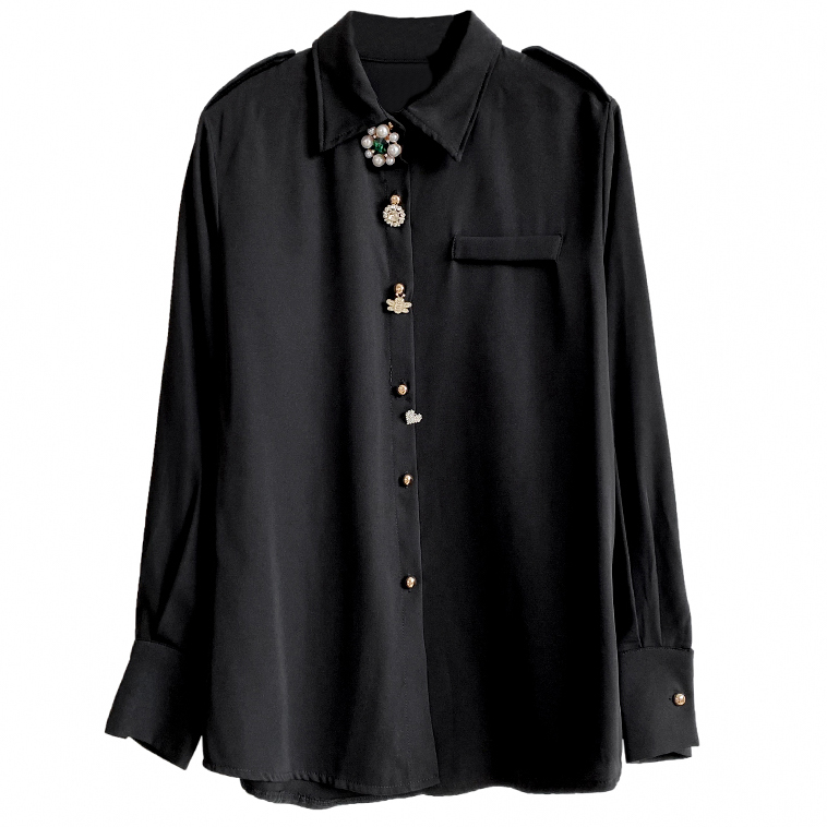 Рубашка черная золотые пуговицы + броши из страз и жемчуга