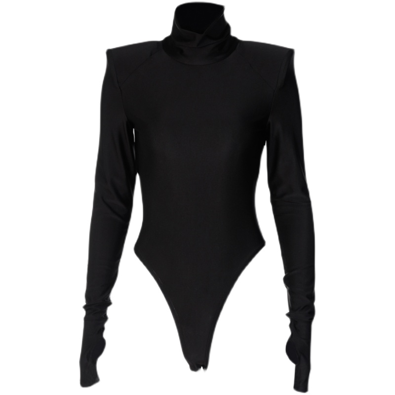 Боди эластичное с подплечниками длинный рукав вырез под палец