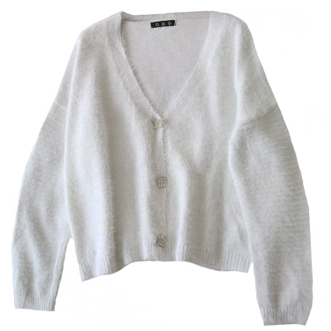 Кардиган пушистый белый 3 пуговицы квадрат в стразах