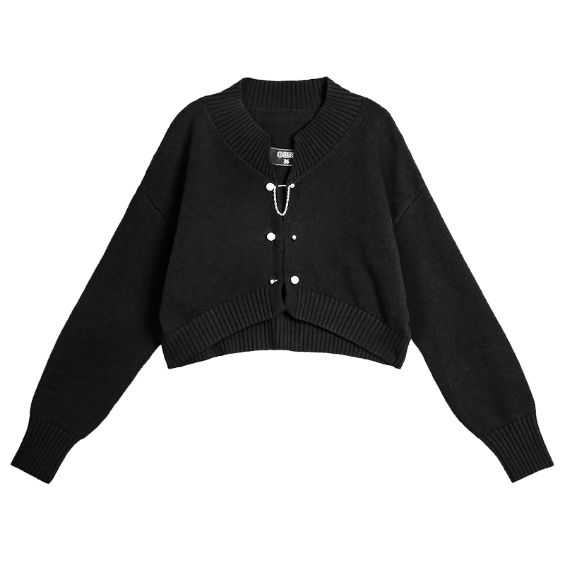 Кардиган короткий по краю в рубчик застежка жемчужины сверху цепь