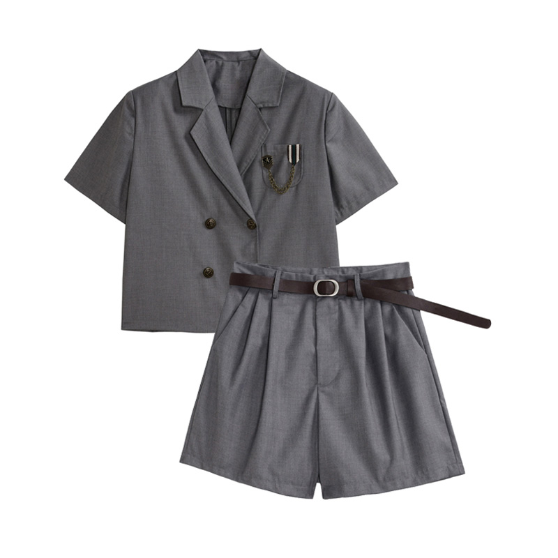Костюм пиджак короткий рукав на кармане 2 значка и цепь + шорты с защипами и поясом