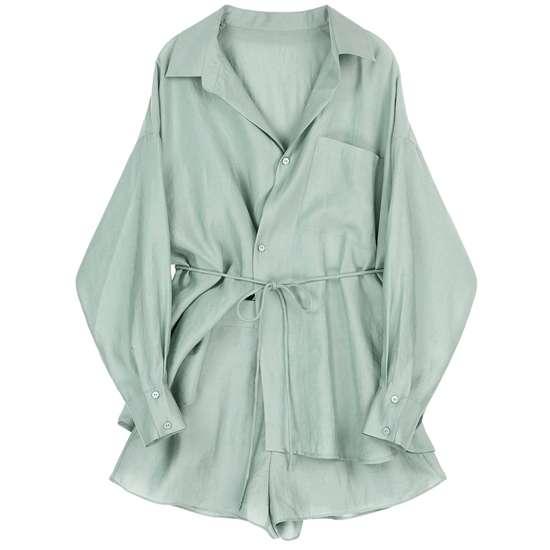 Костюм мятный рубашка с тонким поясом + шорты свободные