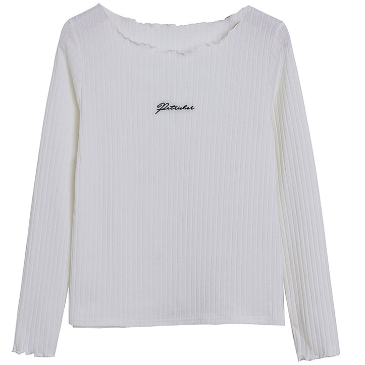 Топ длинные рукава стрейч рубчик вышивка надпись волнистые края