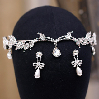 Набор украшение на голову листья со стразами + серьги банты жемчужина