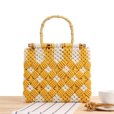 Сумка тоут плетеная белые ромбы бамбуковая ручка
