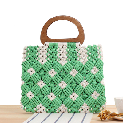 Сумка тоут плетеная белые ромбы деревянная ручка