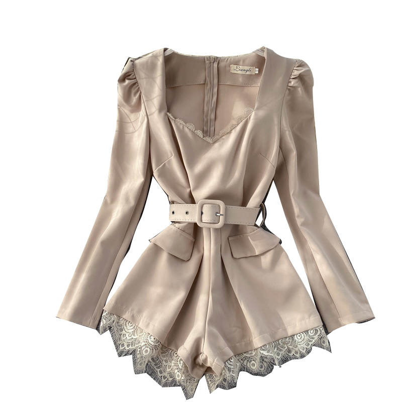 Комбинезон короткий V вырез длинный рукав снизу кружево + пояс