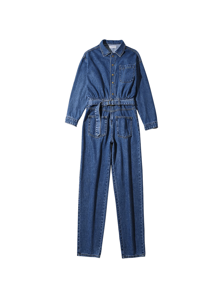 Комбинезон джинсовый длинный с поясом крупные карманы по бокам