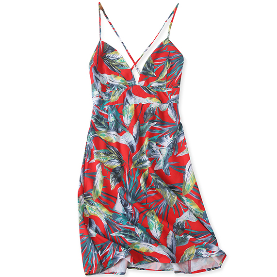 Платье сарафан принт тропические листья на красном перекрестие