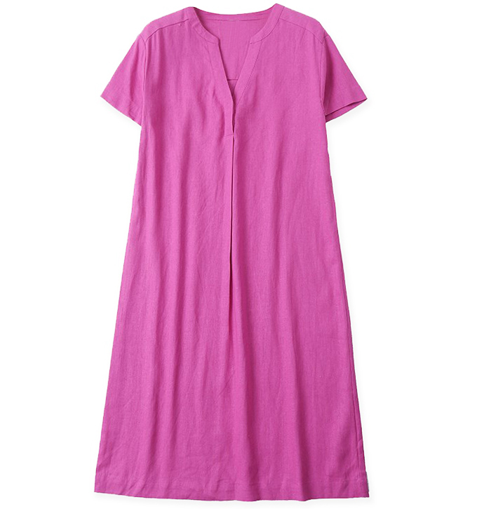 Платье лен фуксия короткий рукав широкий клеш V-вырез