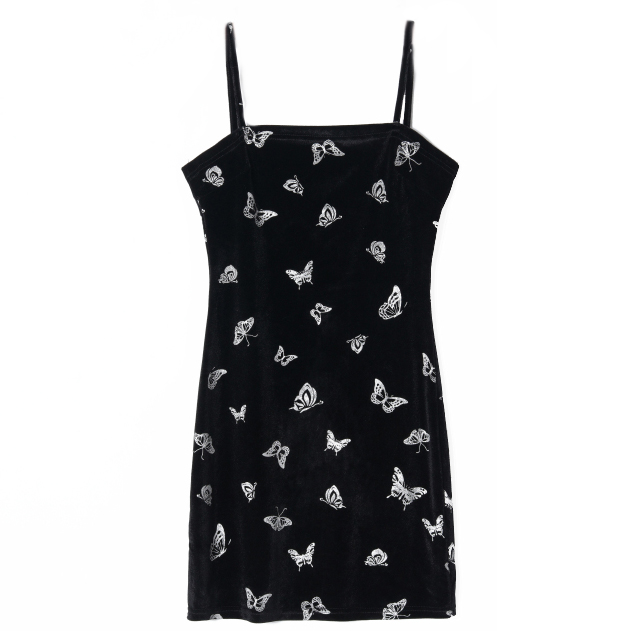 Платье бархат мини тонкие лямки принт серебряные бабочки