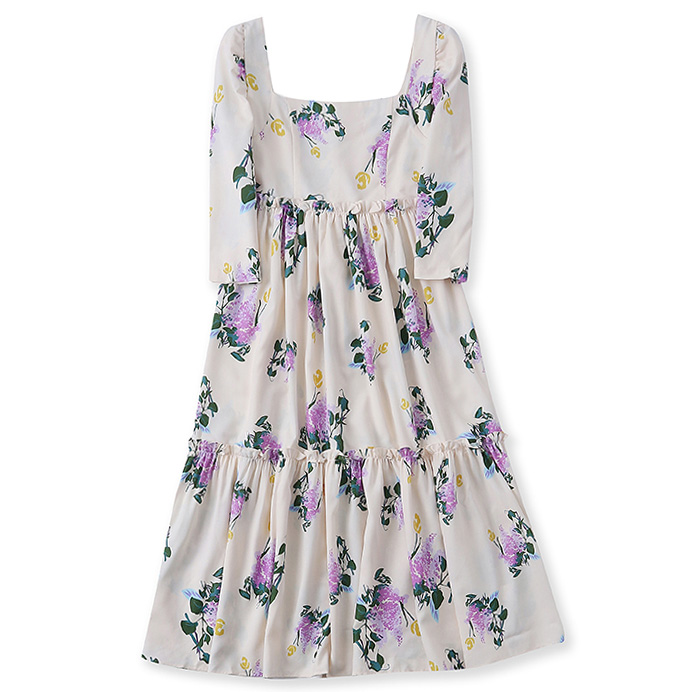 Платье макси юбка клеш уровнями сиреневые цевты квадратный вырез
