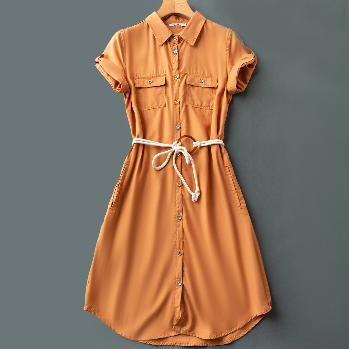 Платье рубашка короткий рукав карманы + веревочный пояс кольцо