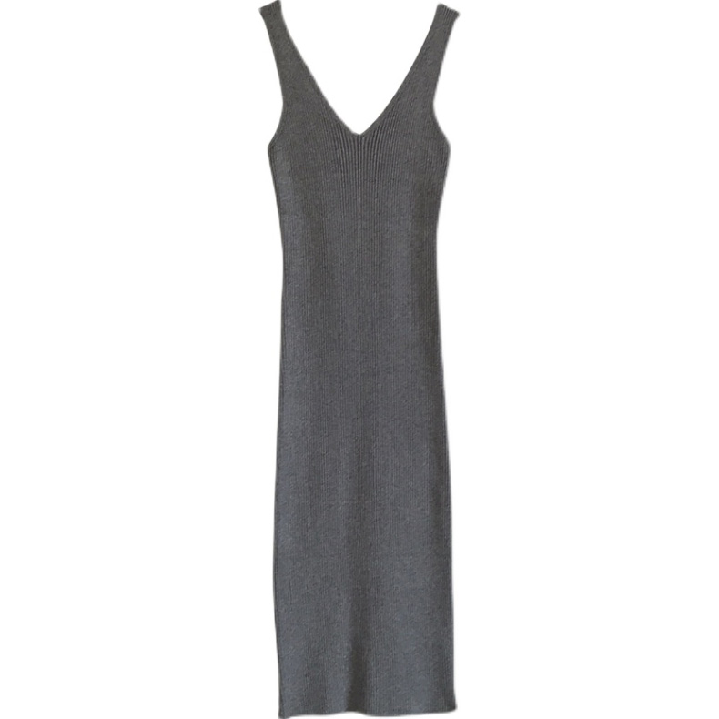 Платье миди трикотаж лямки V-вырез по фигуре (серое)