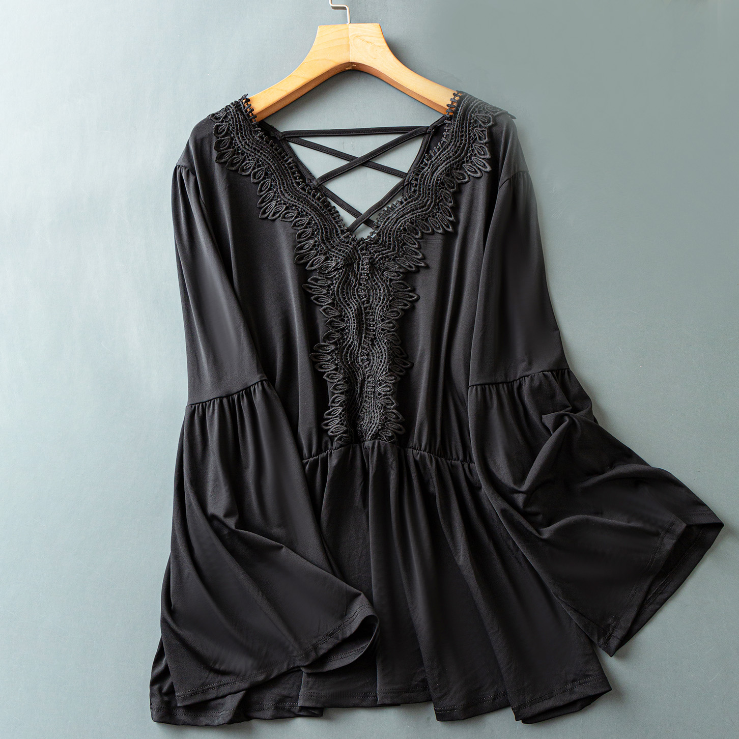 Туника клеш на рукавах кружево на груди перекрестия на спине