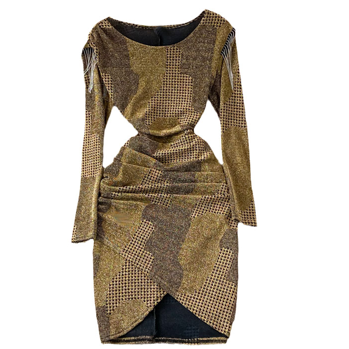 Платье круглый вырез длинный рукав бахрома на плечах пятна разной фактуры + гусинная лапка