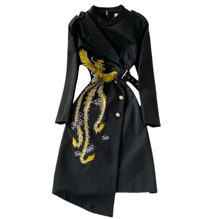 Платье миди асимметричный низ пуговицы сбоку пояс вышивка феникс