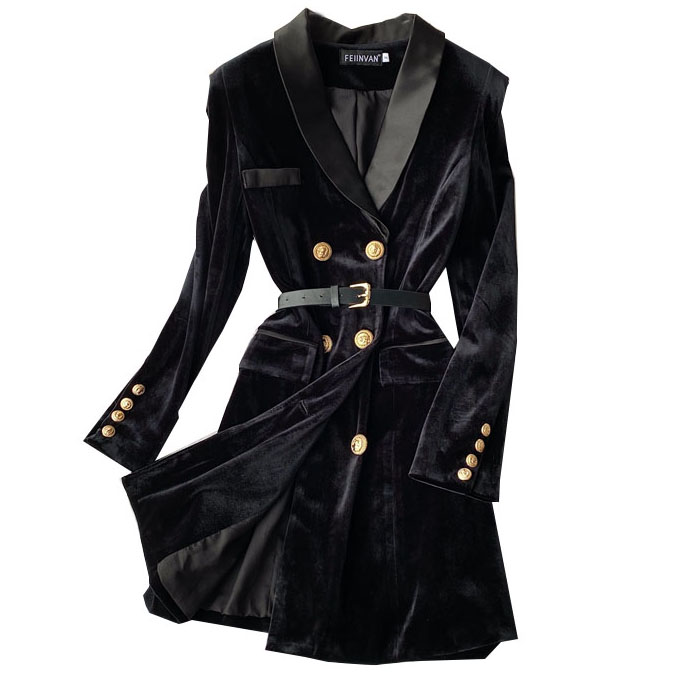 Платье пиджак бархат атласный ворот золотые пуговицы + ремень