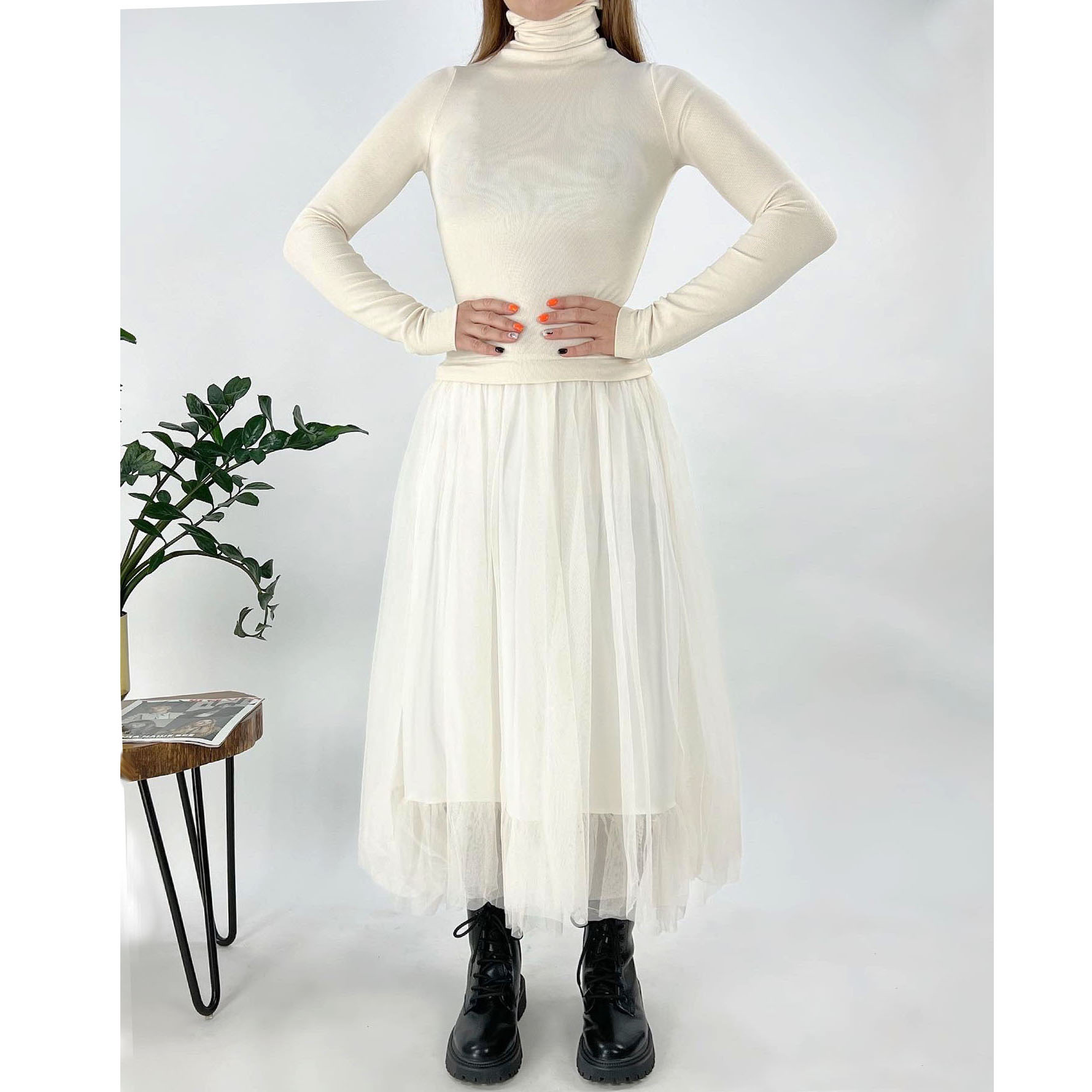 Платье эффект водолазки и длинной юбки пачки из сетки в цвет