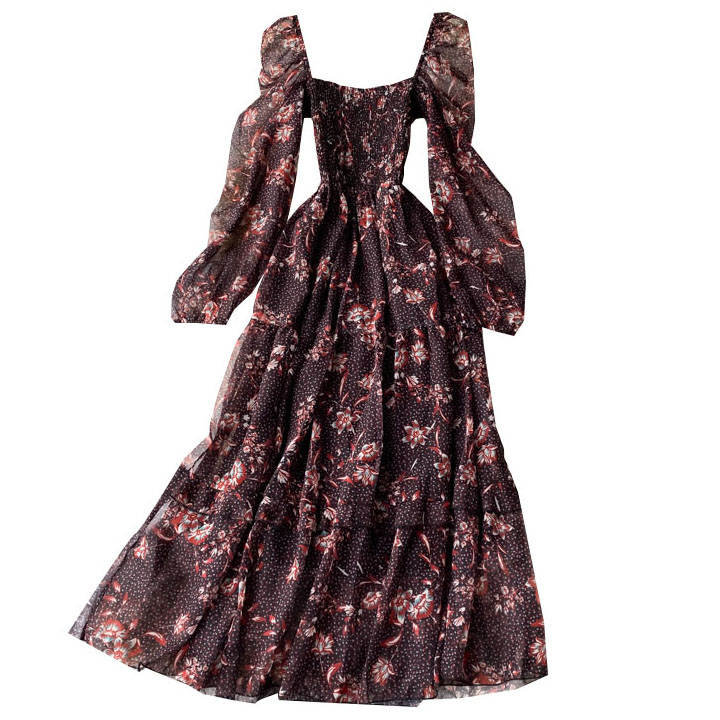Платье миди легкое верх резинкой пышные рукава и юбка принт красные цветы и точки