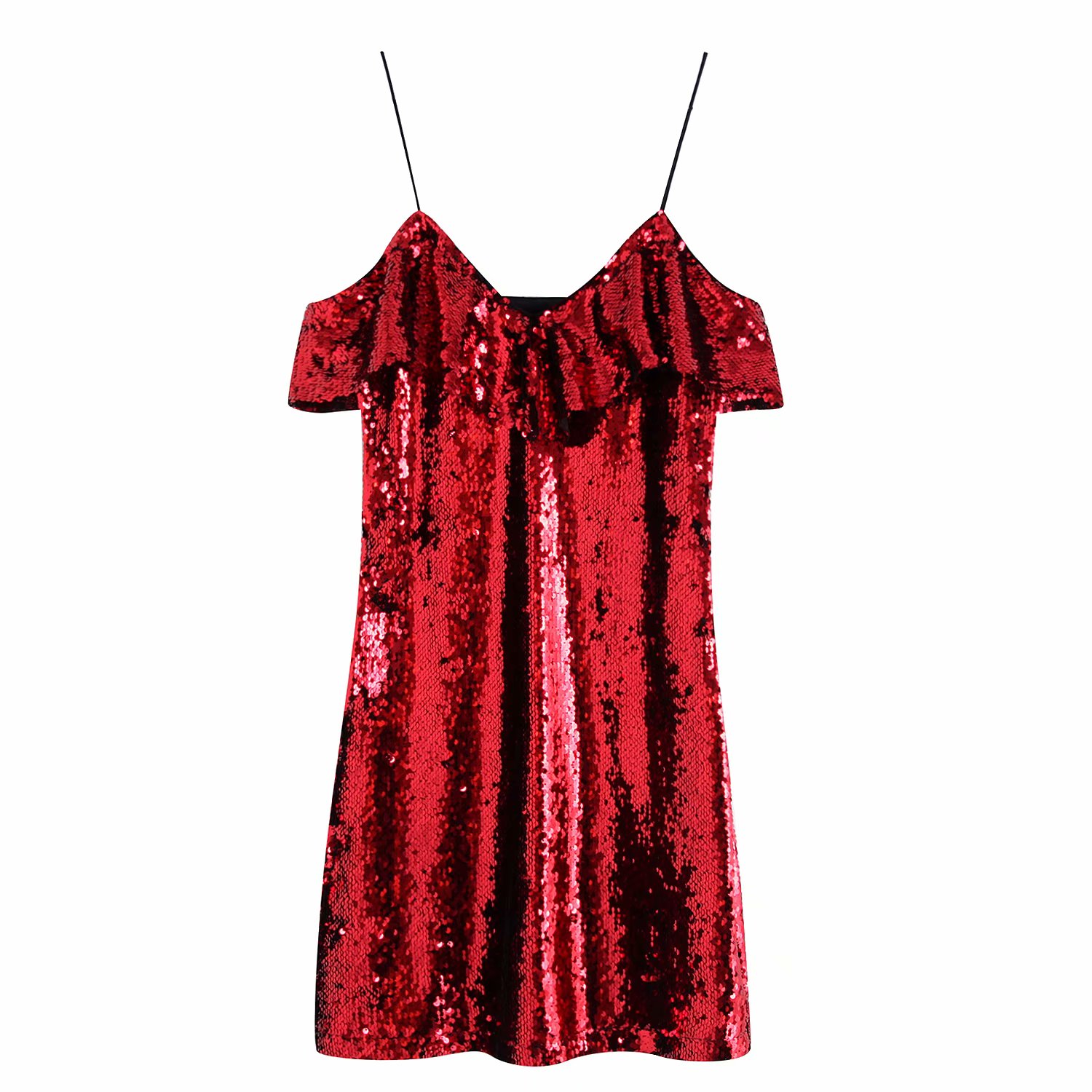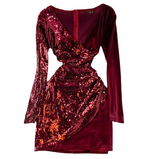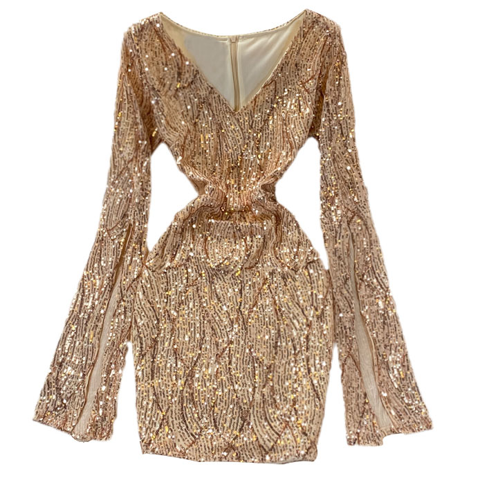 Платье мини V-вырез длинный рукав с разрезом нашиты пайетки