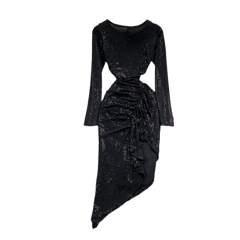 Платье блестящее круглый вырез длинный рукав асимметричный низ сборка сбоку