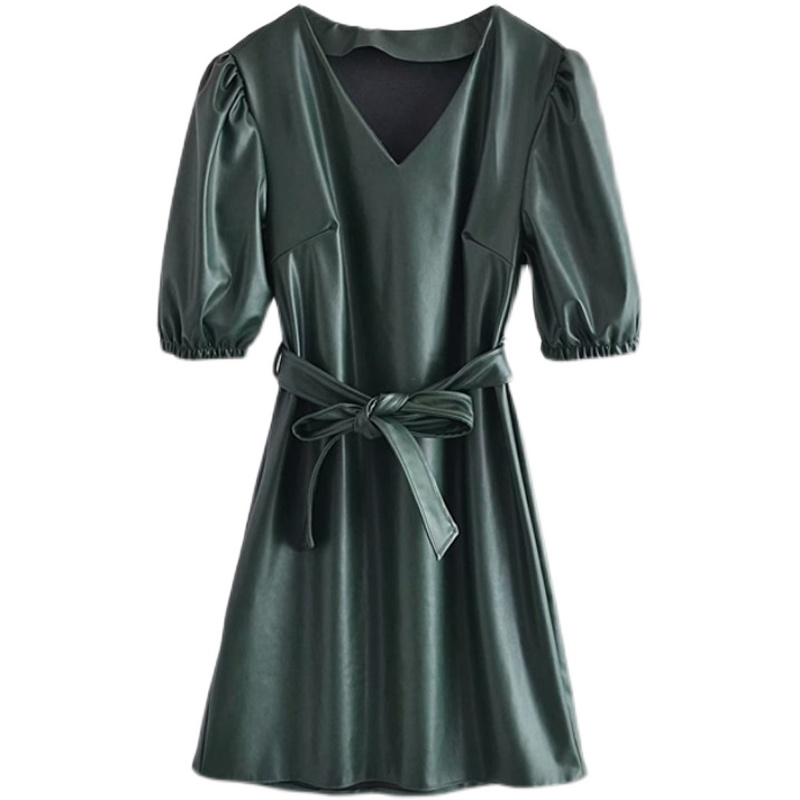 Платье миди эко кожа короткий рукав на резинке + пояс