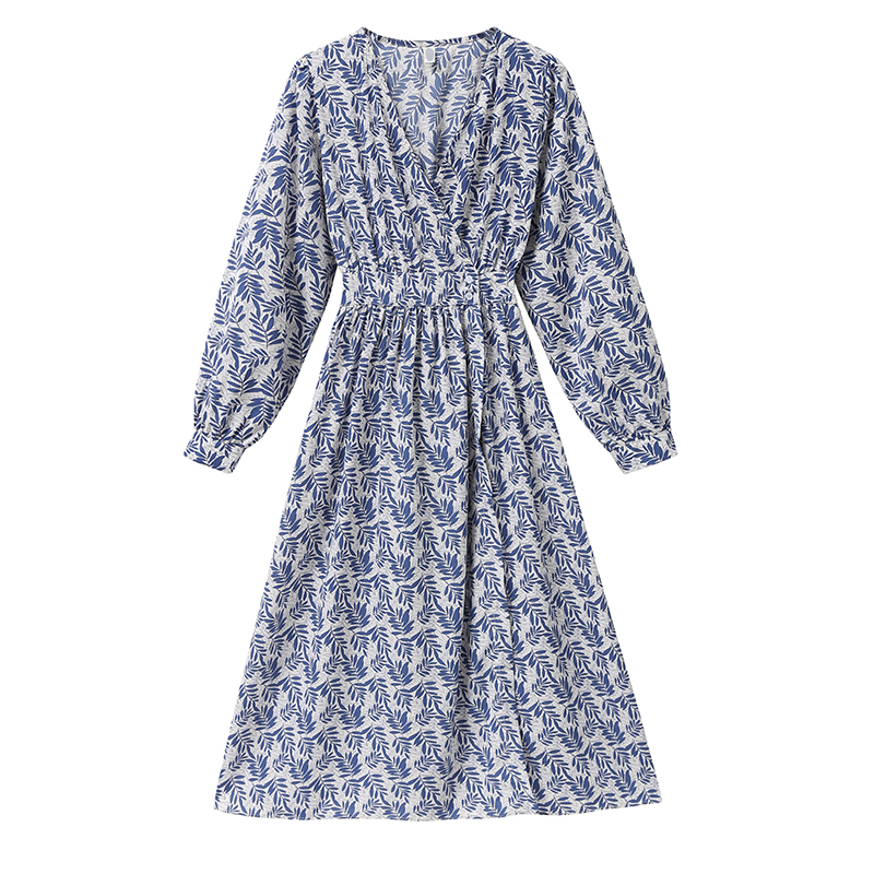 Платье миди шифон V вырез длинный рукав принт растения