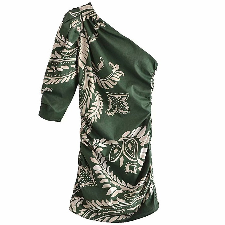 Платье мини на одно плечо по бокам сборка принт белые листья