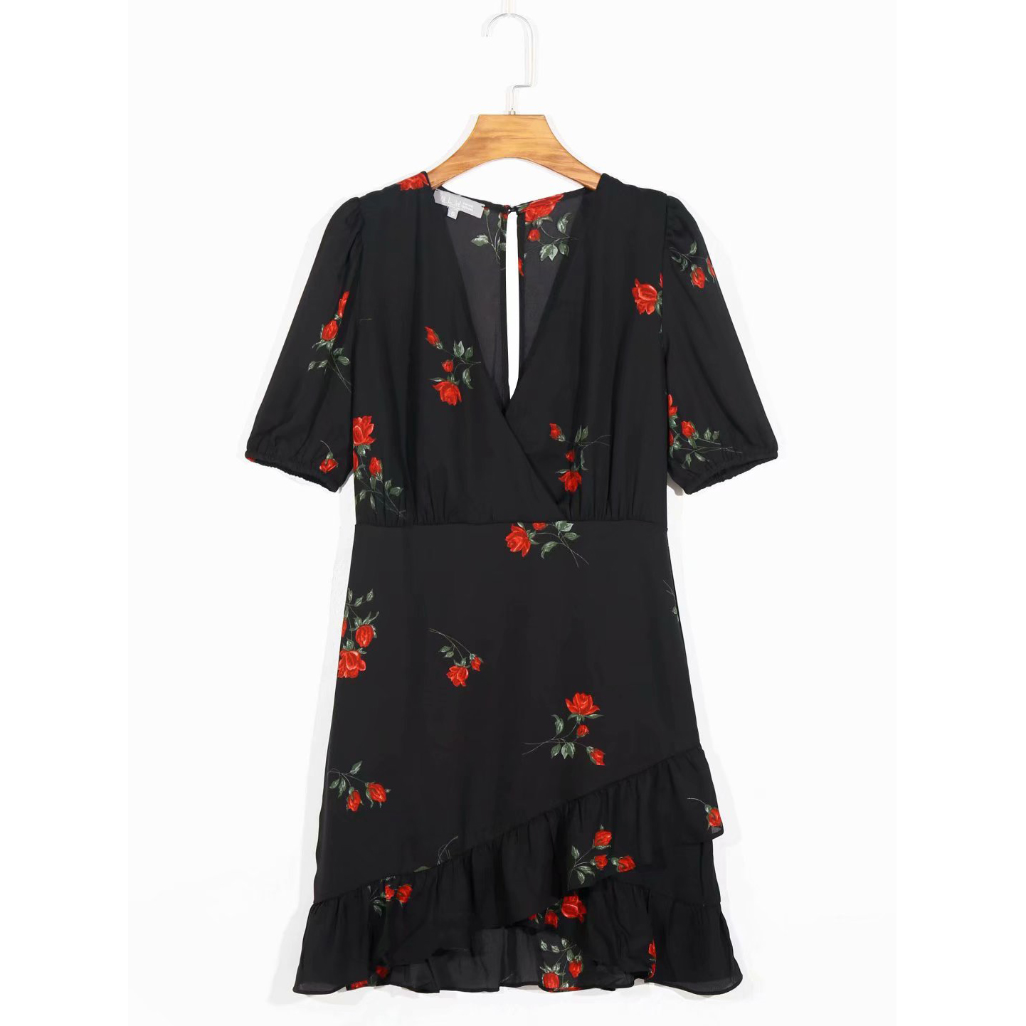 Платье мини глубокий V вырез рюша по низу короткий рукав принт красные розы