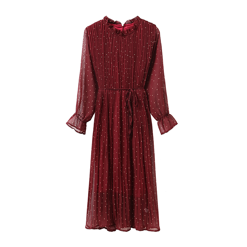 Платье миди шифон длинный рукав на вороте рюша принт мелкий горох + тонкий пояс