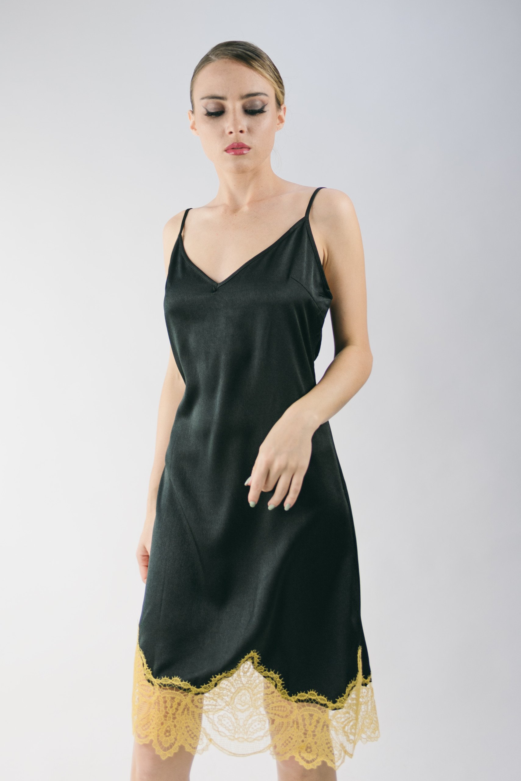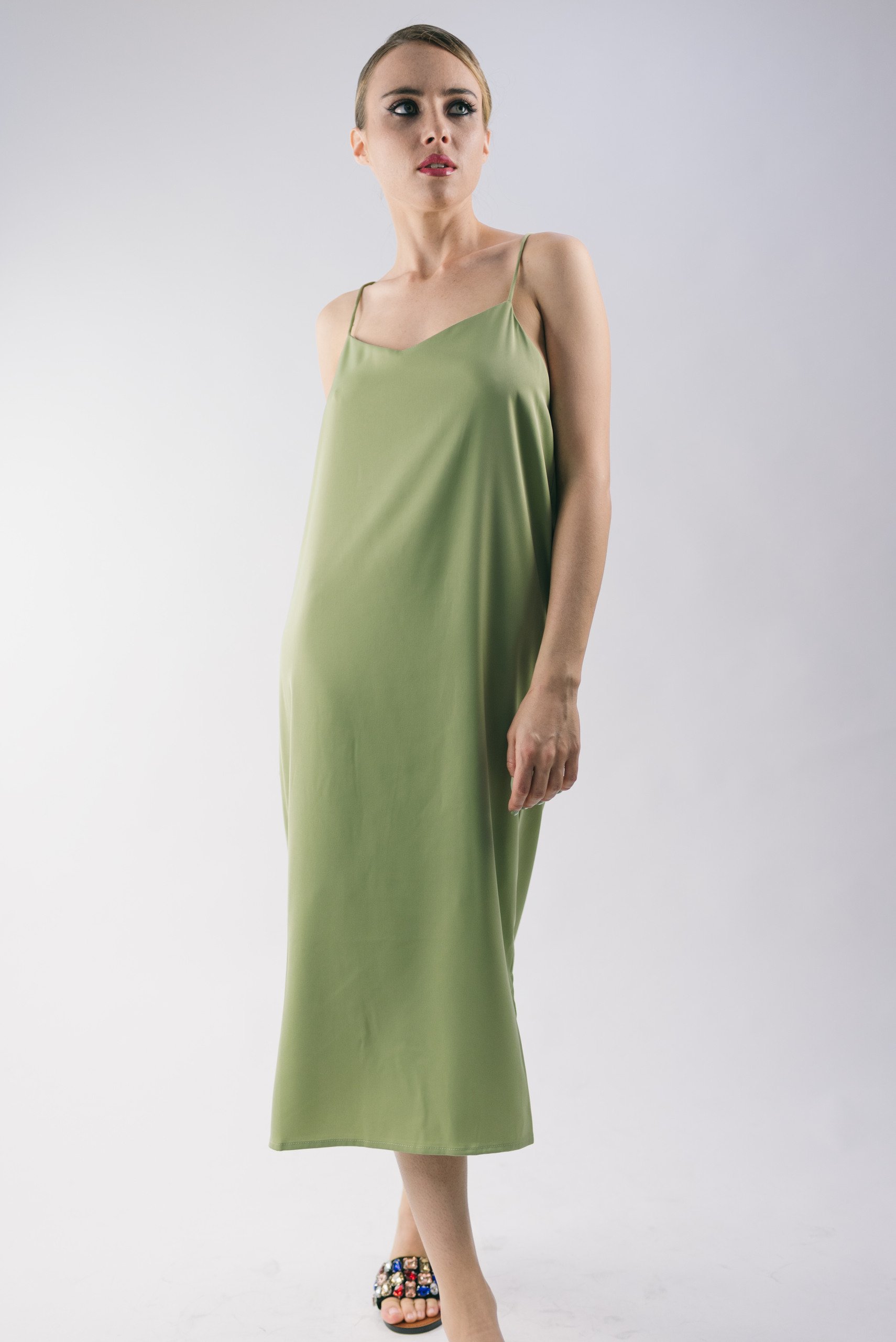 Платье комбинация оливковое 2 коричневых бусины на лямках