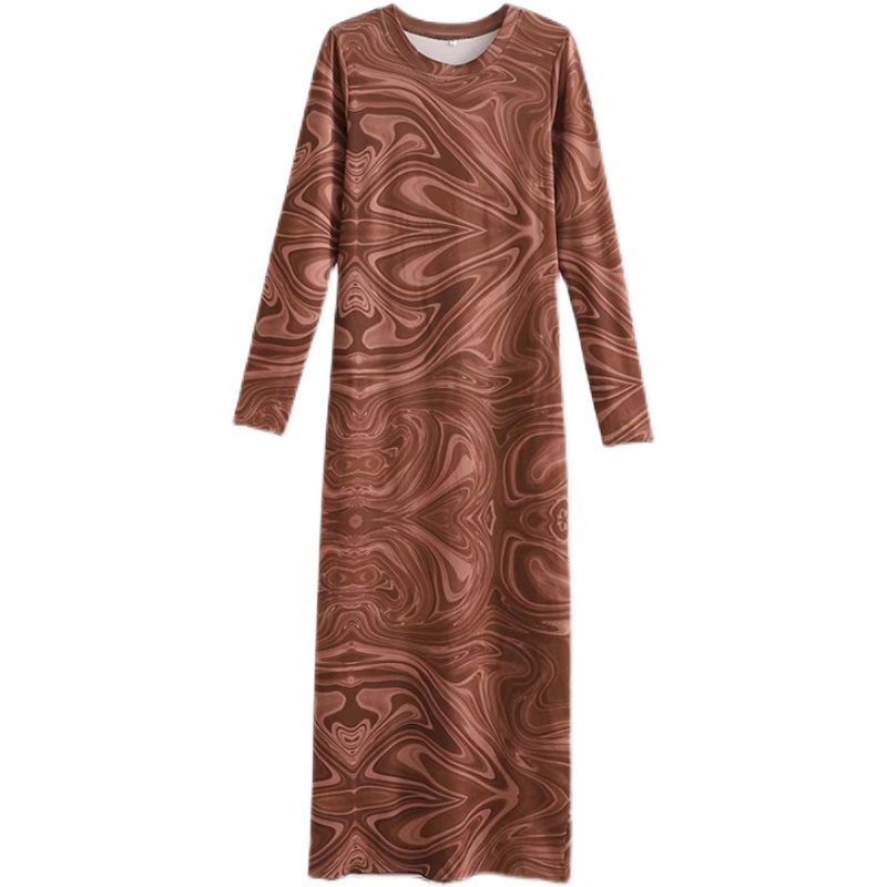 Платье миди коричневое длинный рукав принт разводы