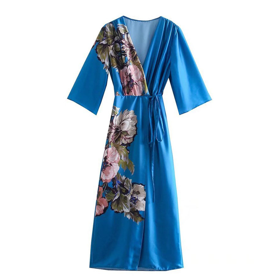 Платье халат на запах V вырез принт крупные цветы