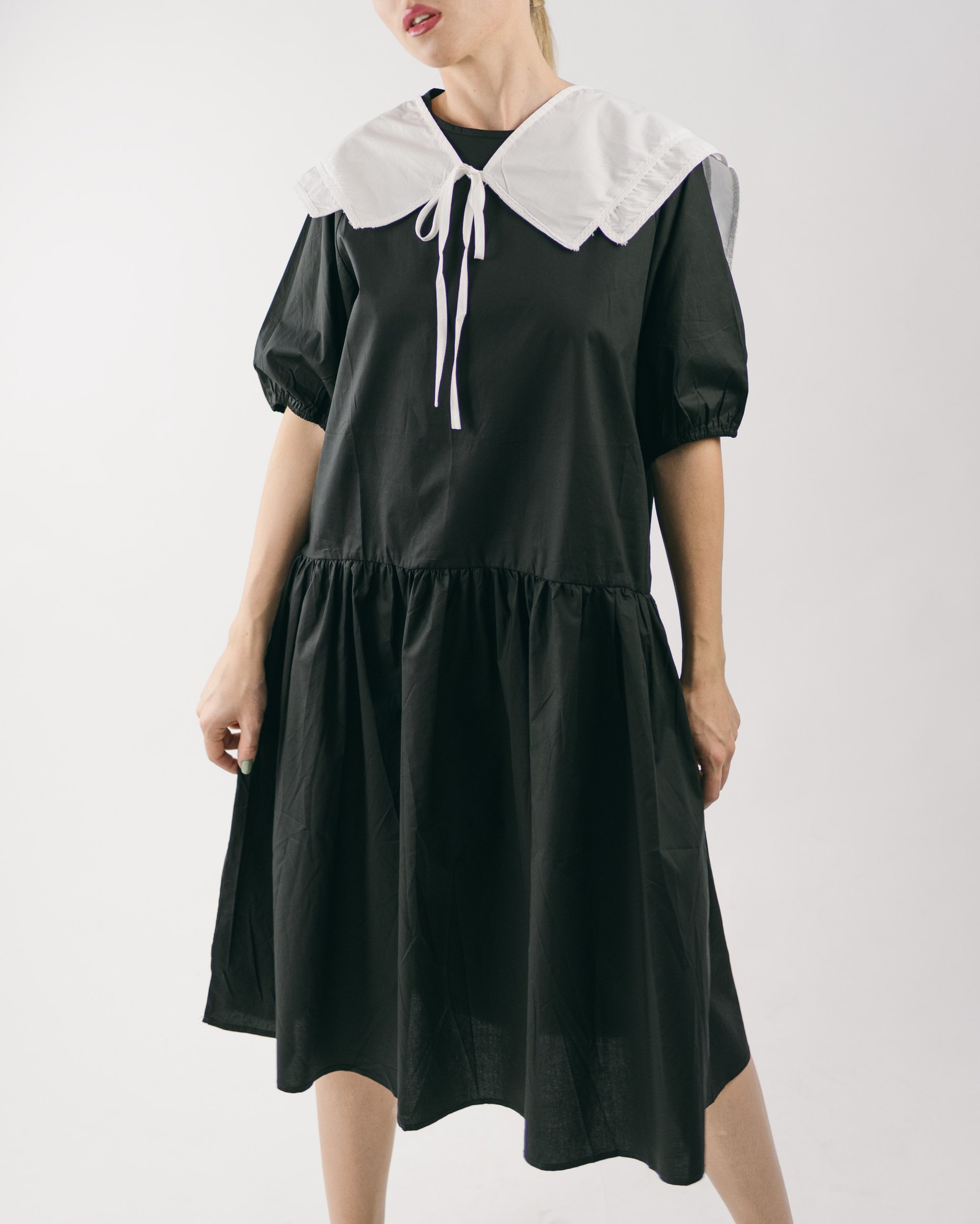 Платье хлопок юбка клеш рукав фонарик + контрастный воротник
