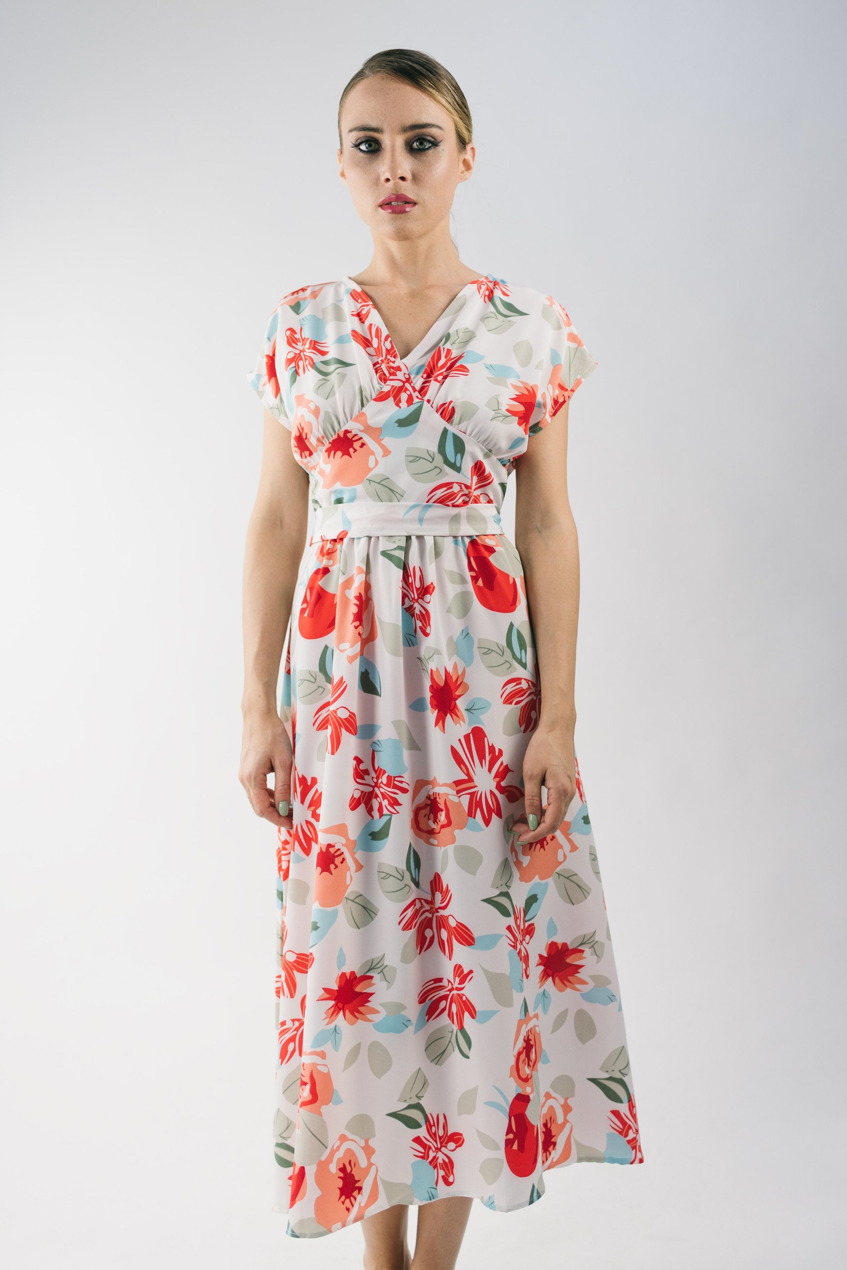 Платье миди V вырез пояс юбка клеш - крупные цветы