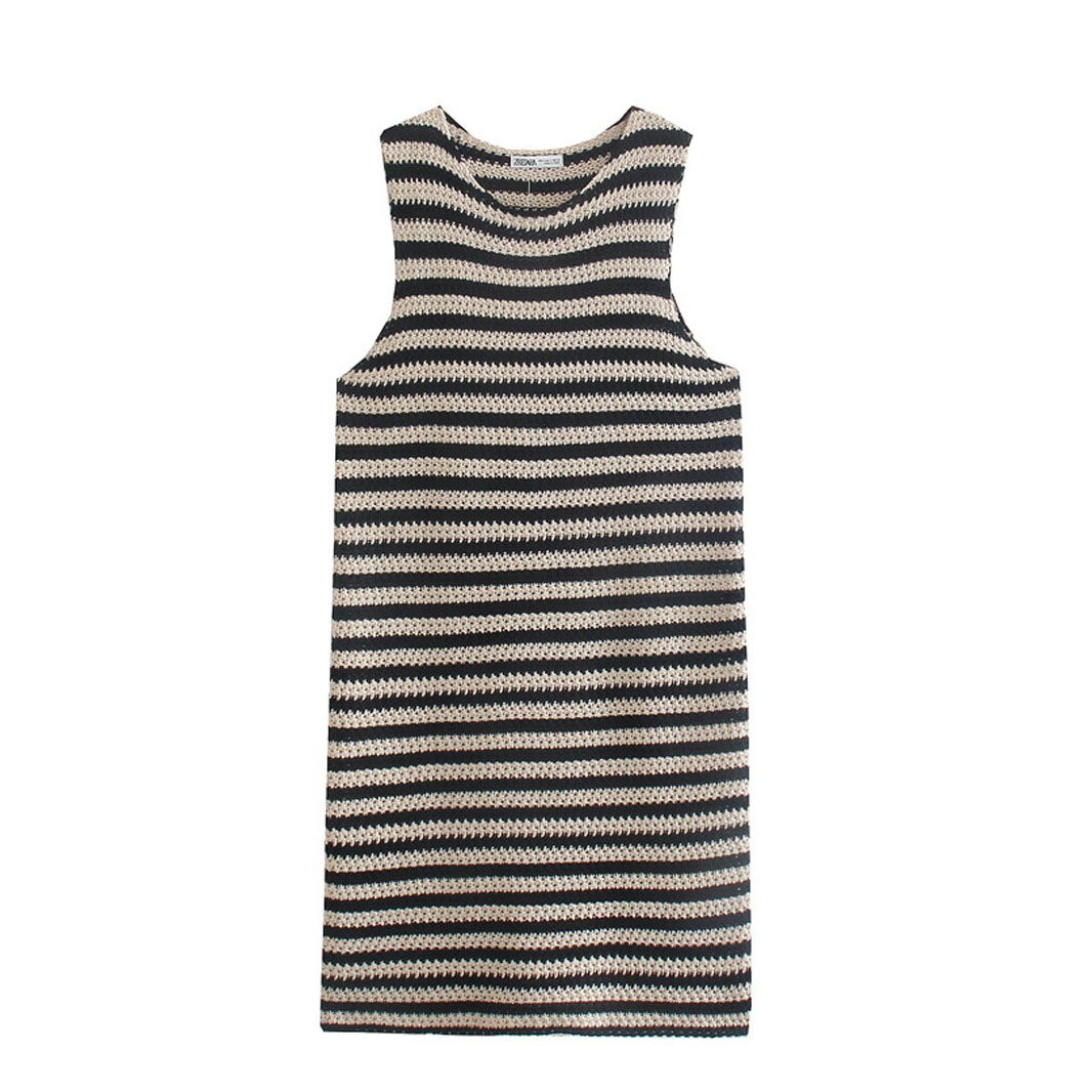 Платье вязаное без рукавов в черно-бежевую полосу