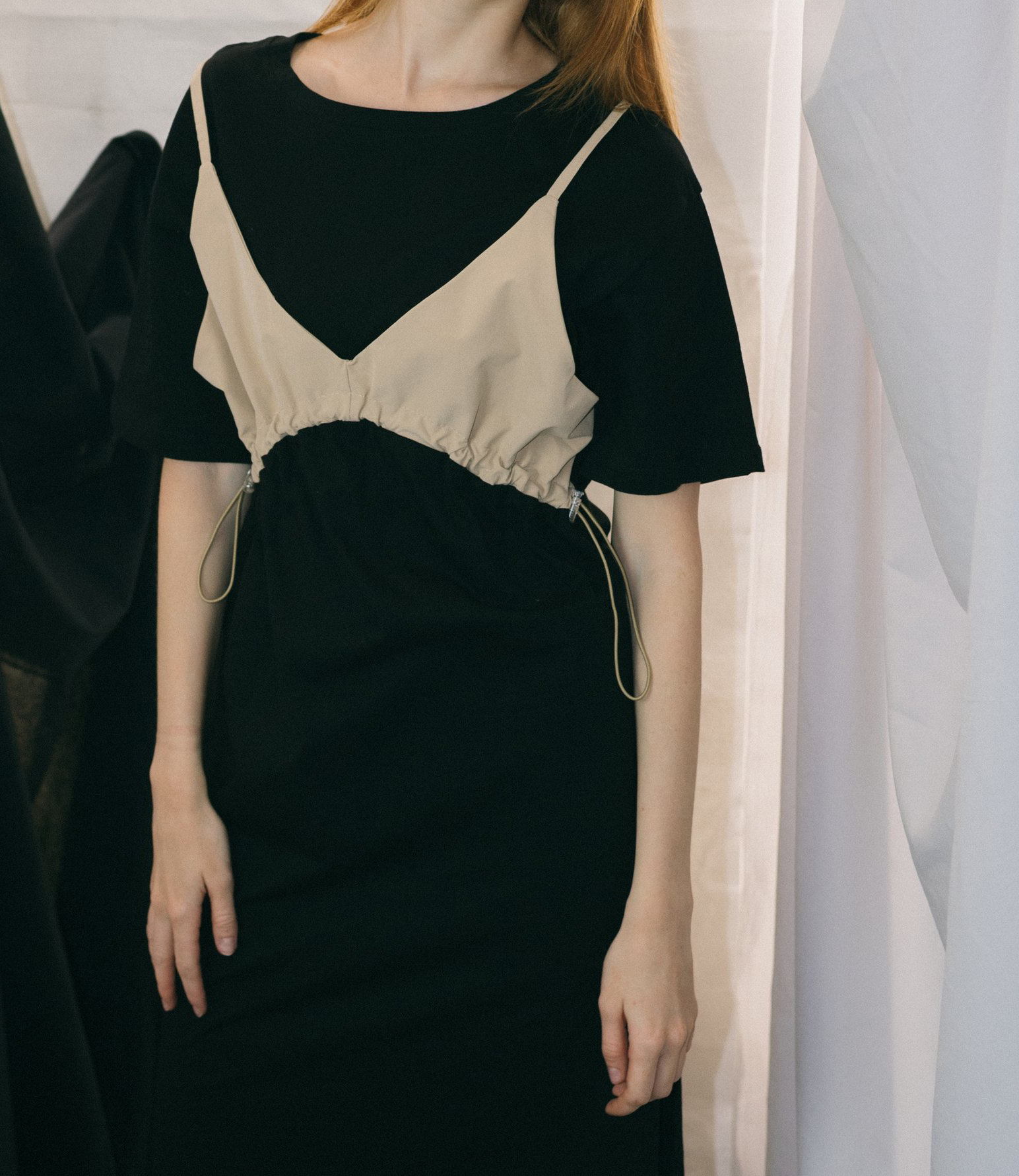 Платье футболкой имитация бежевого топа с кулиской под грудью