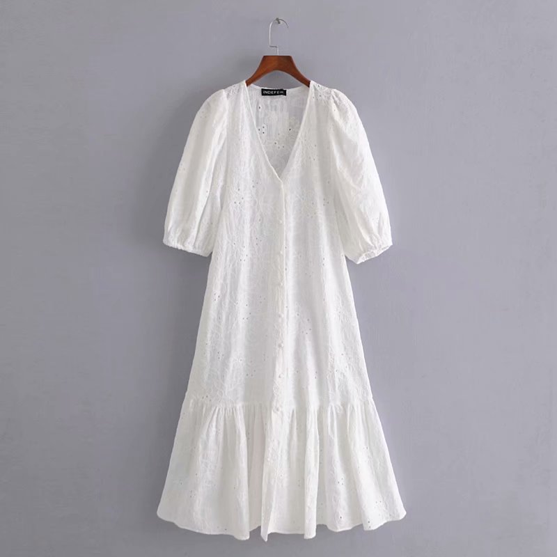 Платье макси на пуговицах объемный короткий рукав вышивка цветы